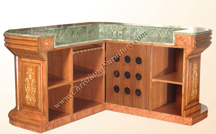This beech wood bar is a blend of historic style and modern durability that defines elegant entertainment. This bar is contructed of the finest materials to ensure it lasts year after year. Behind this bar you can proudly serve your guests over an authentic natural marble top. Among its features are also the beveled mirrors, glass shelves and the inlaid marquetry veneer.